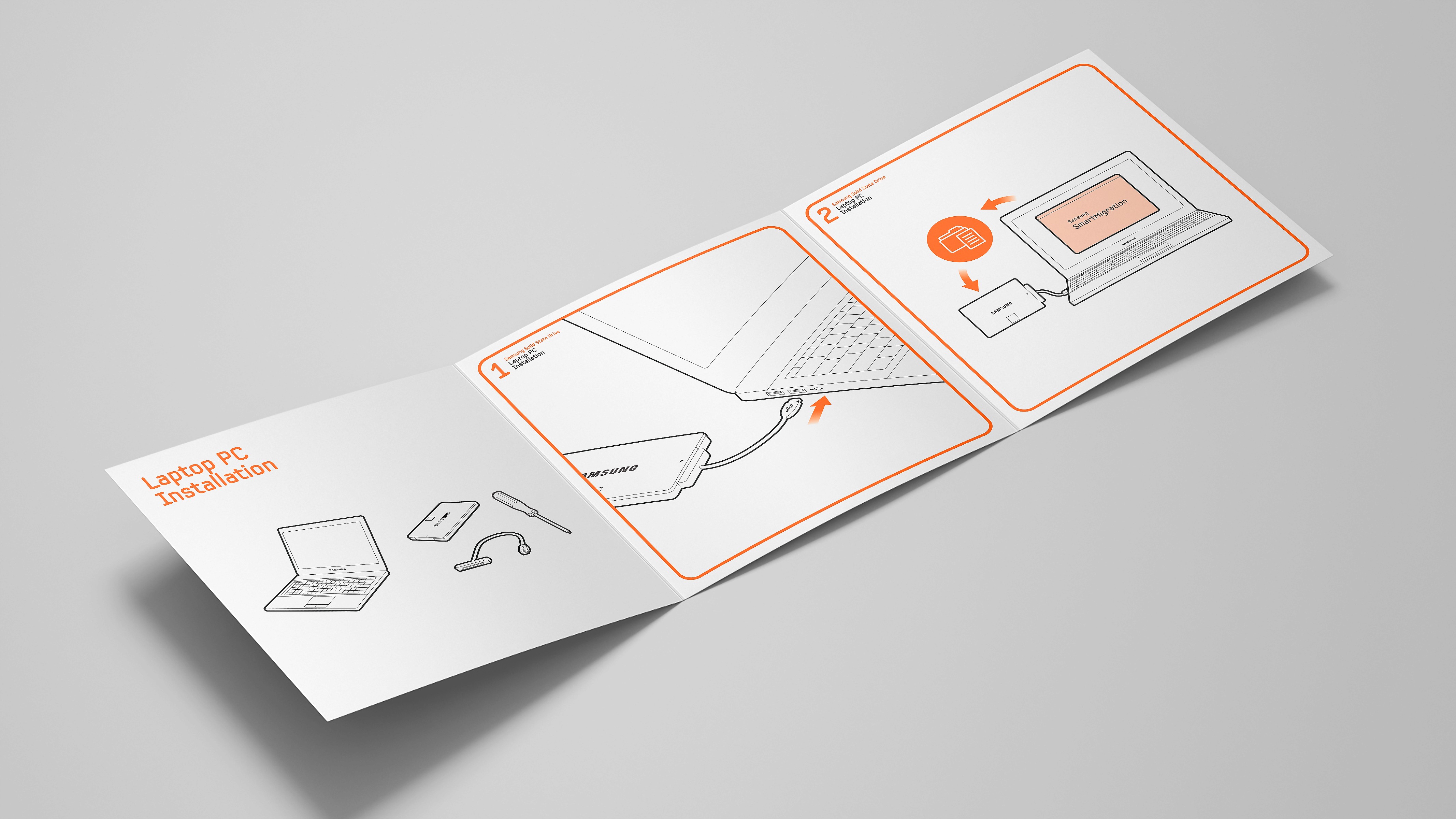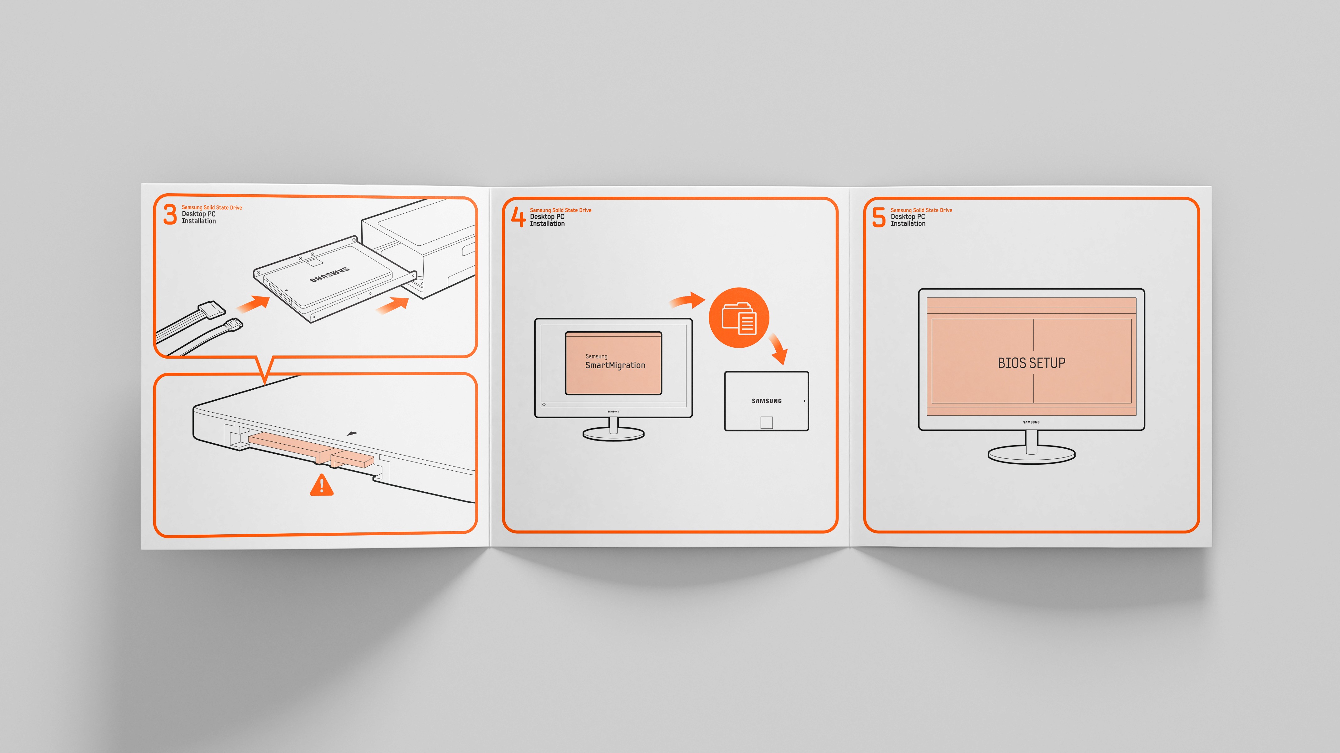 Samsung offers a competitive SSD portfolio of various form factors with high performance, high capacity, and power efficiency. We designed the guide from a user-centered perspective to make it easier and faster to install SSDs for Samsung semiconductors, which are receiving hot responses from customers, as well as corporate SSDs. It is designed to allow anyone to easily install SSDs in PCs and laptops that are beyond language constraints with easy-to-understand graphics and guidance displays. 삼성은 고성능, 고용량, 전력 효율성을 갖춘 다양한 폼팩터의 경쟁력 있는 SSD 포트폴리오를 제공하고 있다. 기업용 SSD뿐만 아니라 소지자용 SSD를 시장에 내놓고 고객으로부터 뜨거운 반응을 얻고 있는 삼성 반도체의 SSD를 보다 쉽고, 빠르게 설치할 수 있도록 사용자 중심의 관점으로 가이드를 디자인하였다. 단계별로 이해하기 쉬운 그래픽과 안내 표시로 언어의 제약을 넘어서 누구라도 쉽게 SSD를 원하는 PC 및 노트북에 설치할 수 있도록 제작했다.