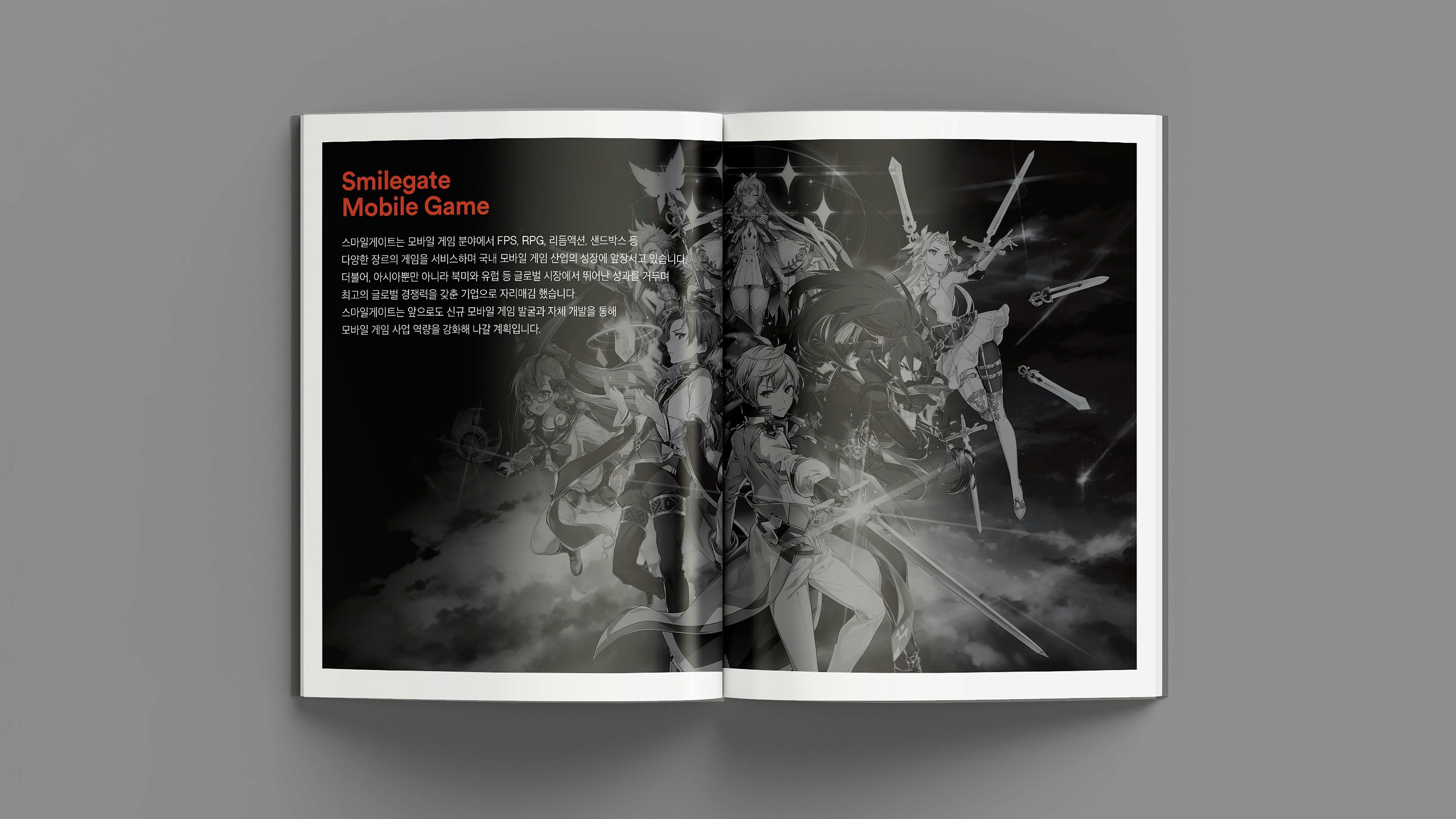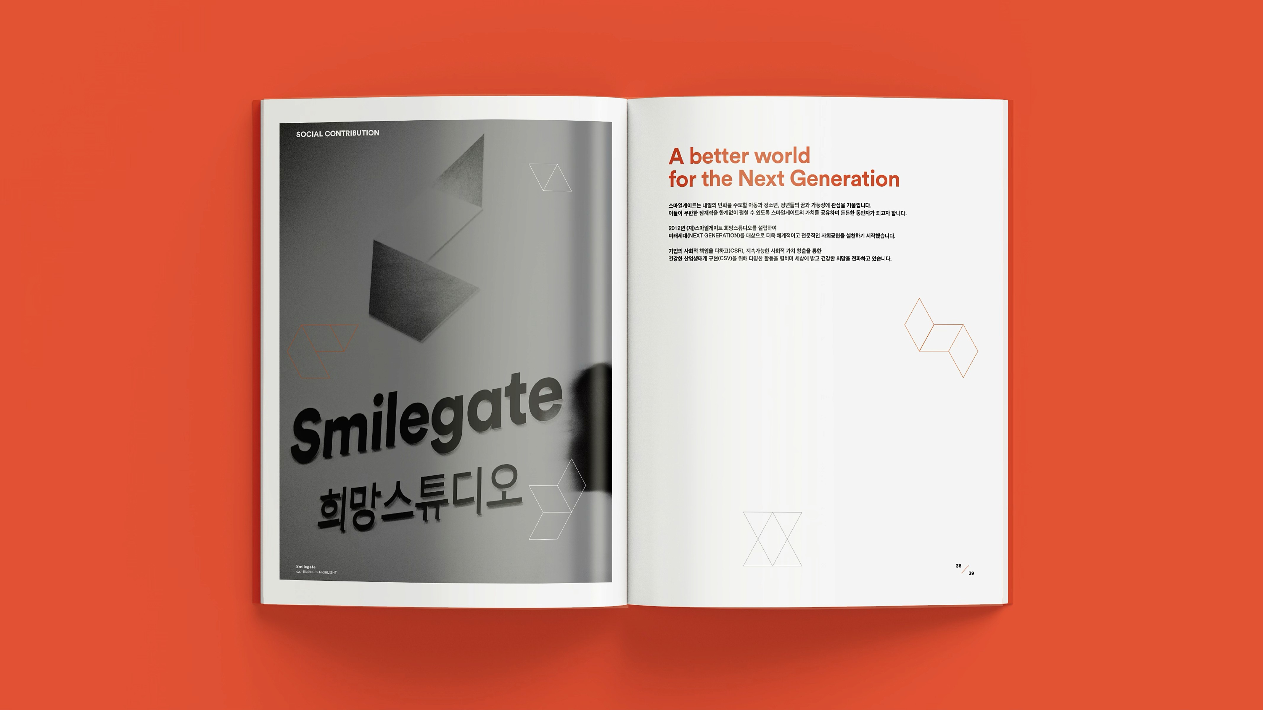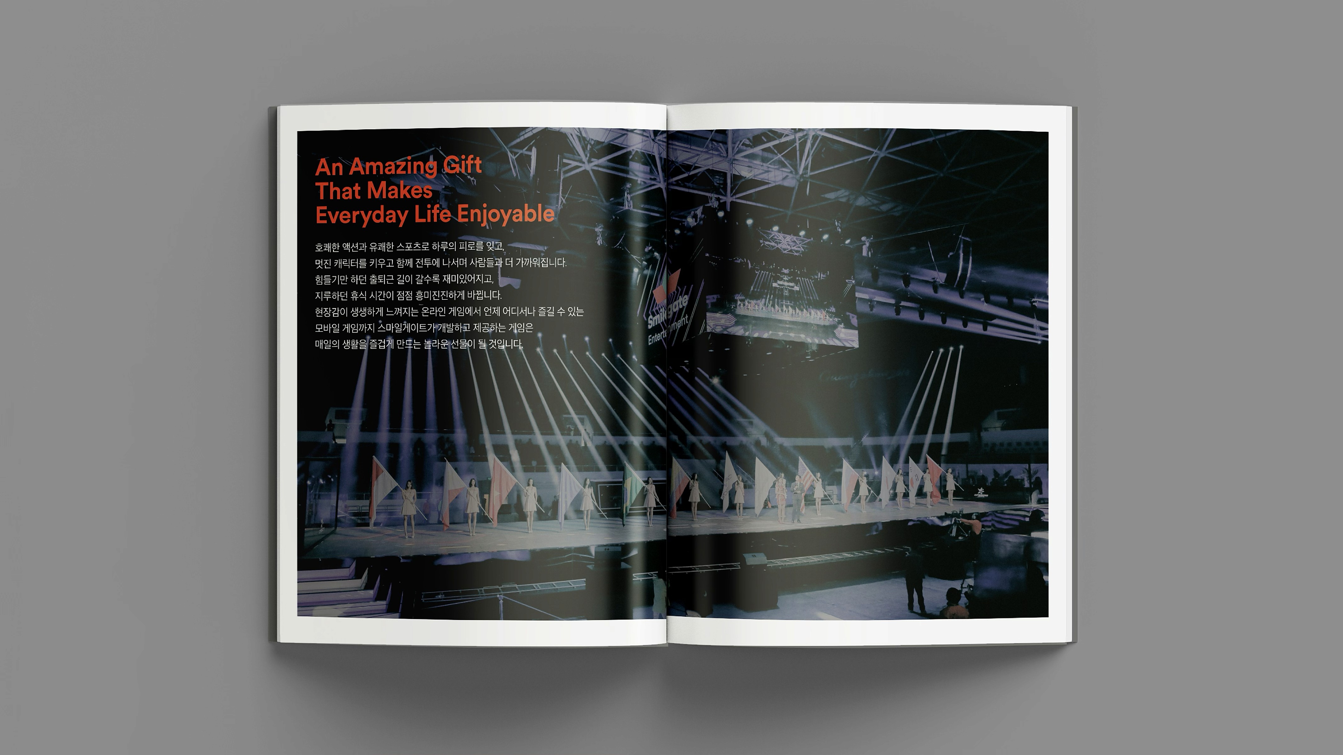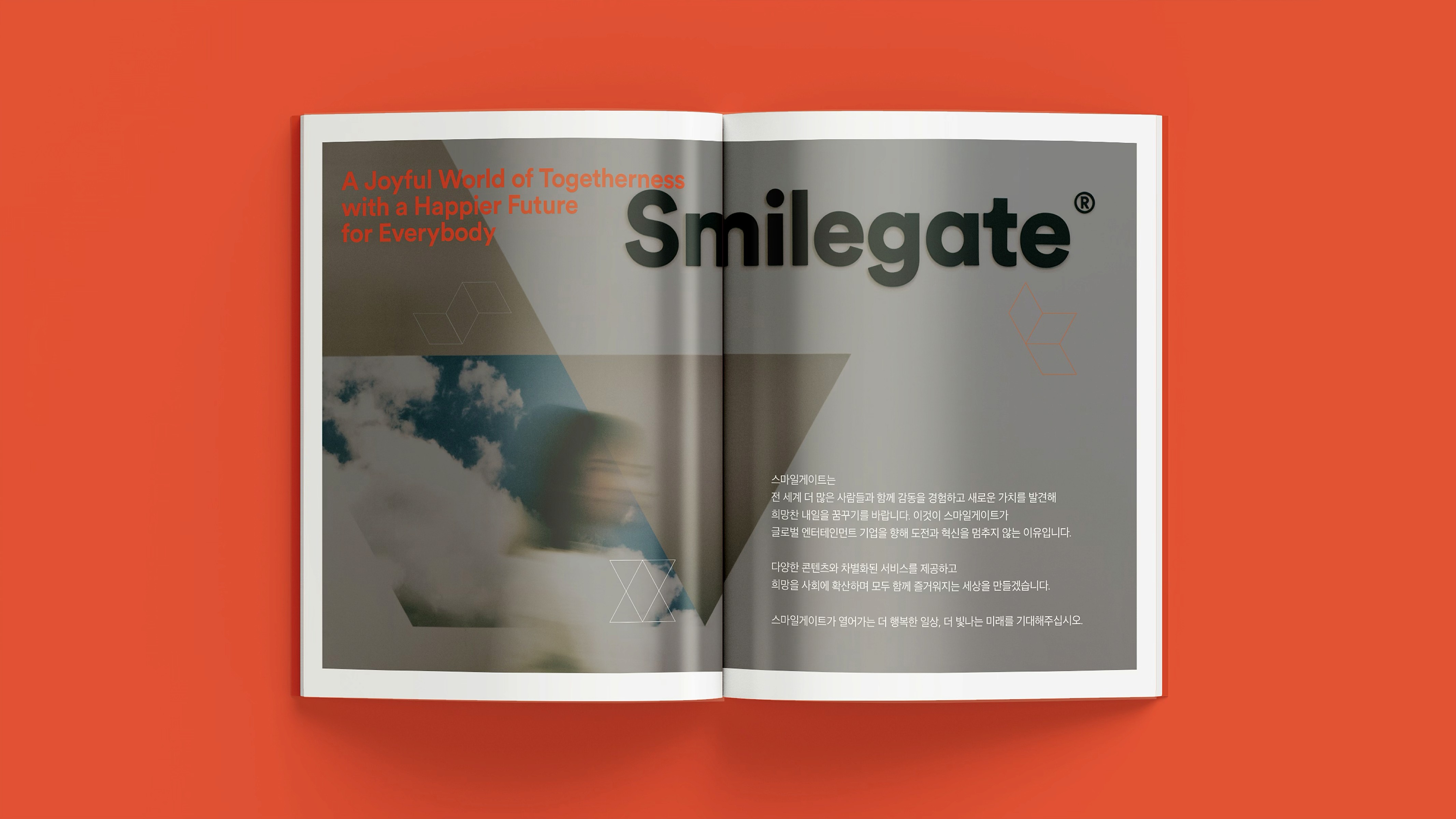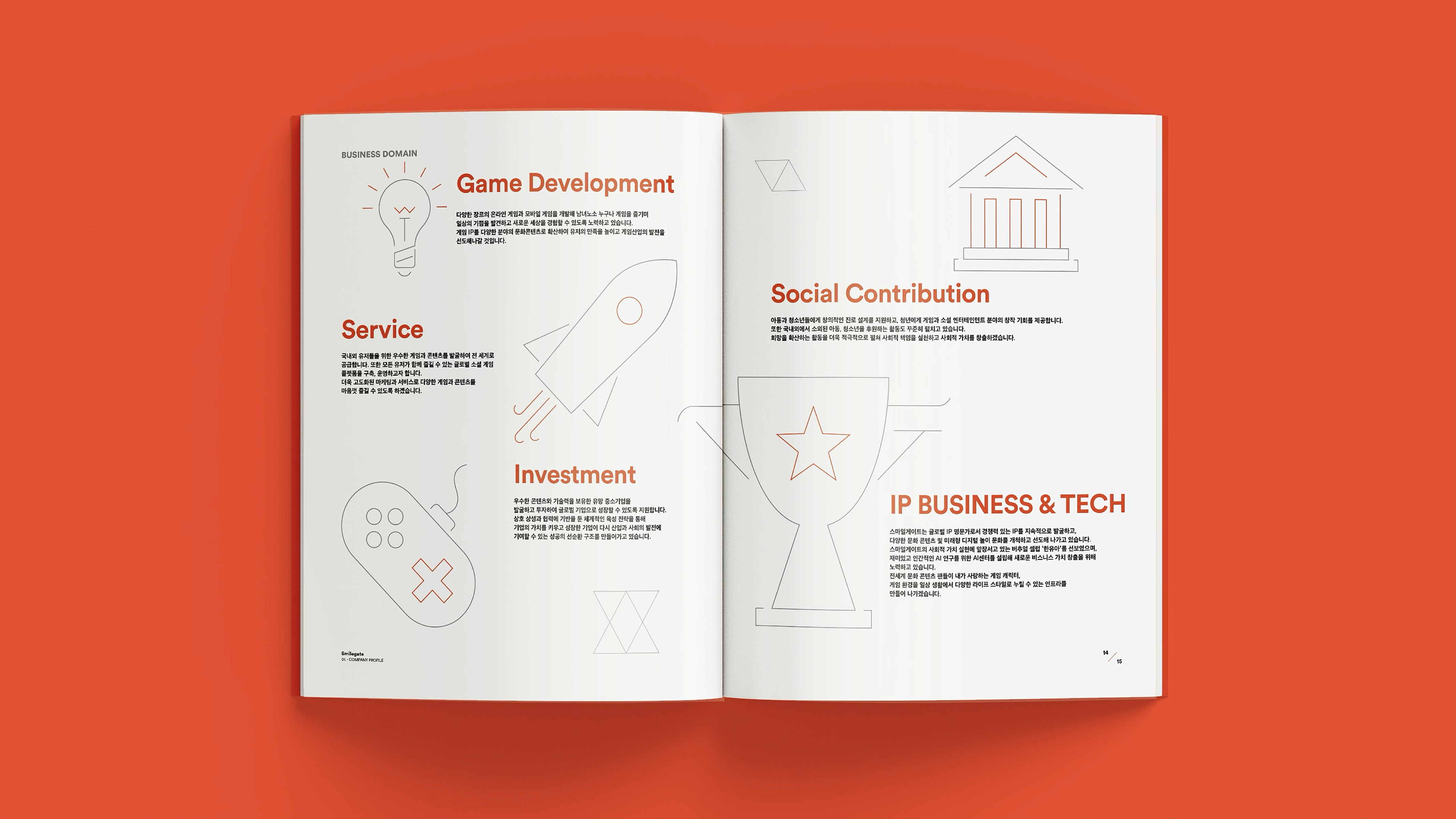 With a vision to become a globally beloved powerhouse of IP, Smilegate® delivers joyful gaming experiences, diverse entertainment content, and user-friendly services. This brochure showcases the core values, vision, and wide-ranging achievements Smilegate® has built across its business. From globally successful games to original IPs spanning various genres, our story is told through a branding approach that is both premium and engaging. 즐거운 게임, 다양한 엔터테인먼트 콘텐츠, 유저 친화적 서비스로 사랑받는 글로벌 IP 명가로 회사의 비전, 밸류 및 사업 전반에 걸쳐 스마일게이트®가 만들어 온 것들을 소개하며, 서비스하고 있는 게임 및 다양한 IP들을 담았습니다. 스마일게이트®의 브랜딩을 브로슈어에 충실히 반영하여 고급스럽고 재미있게 구성.